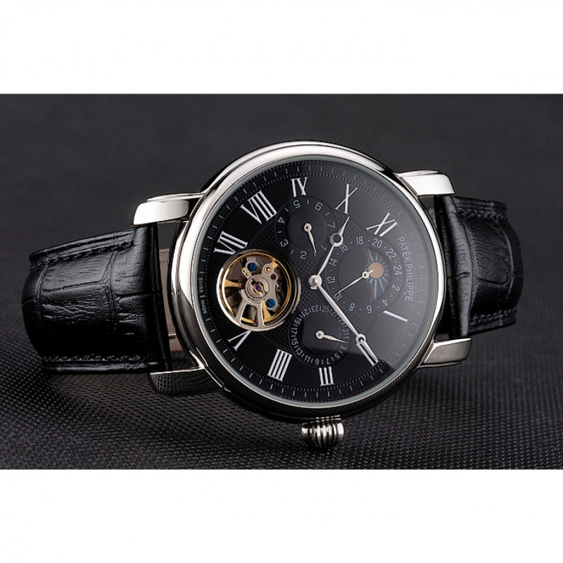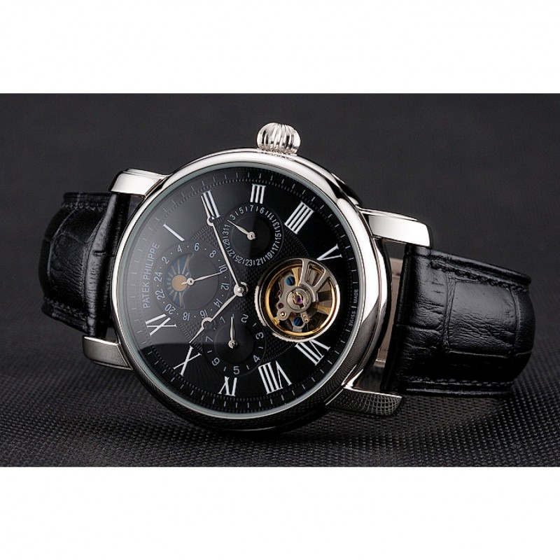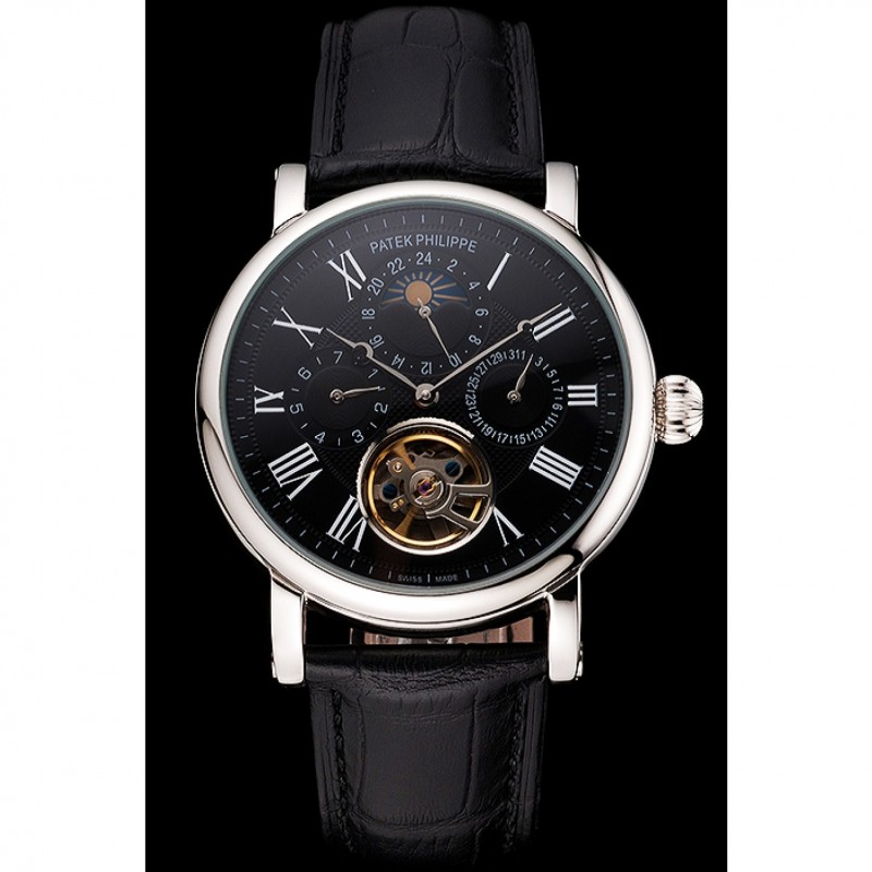 Patek Philippe Grand complicaciones Fase lunar Calendario Perpetuo Tourbillon Negro Dial correa de cuero caja de acero inoxidable Negro