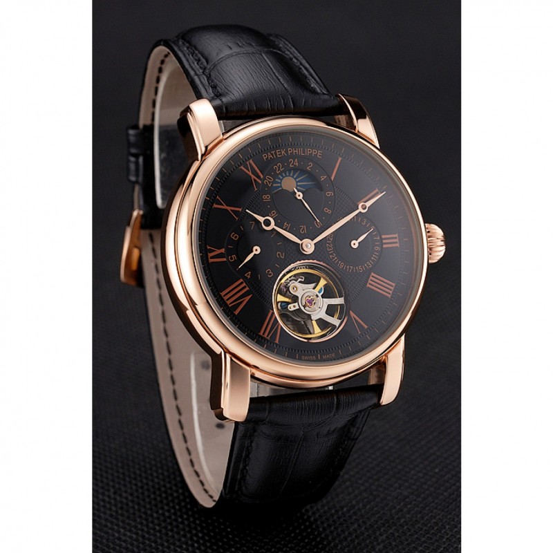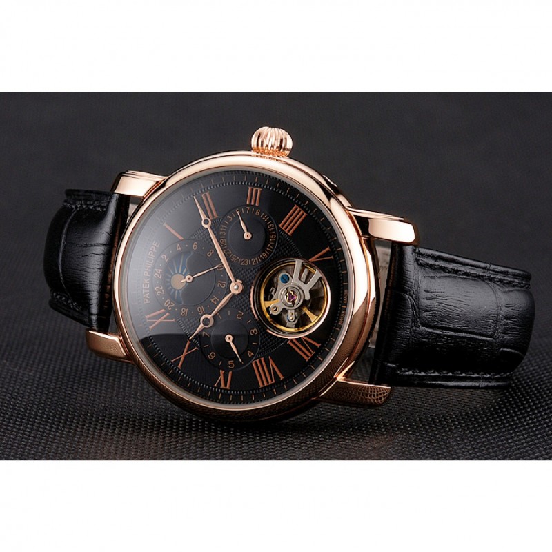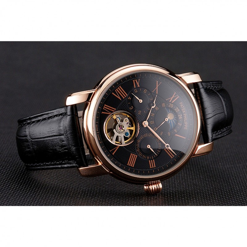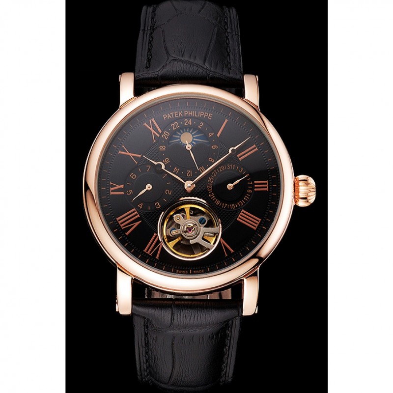 Patek Philippe Grand complicaciones Fase lunar Calendario Perpetuo Tourbillon Negro Dial correa de cuero de la caja de oro rosa Negro