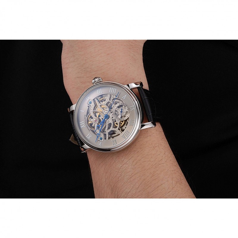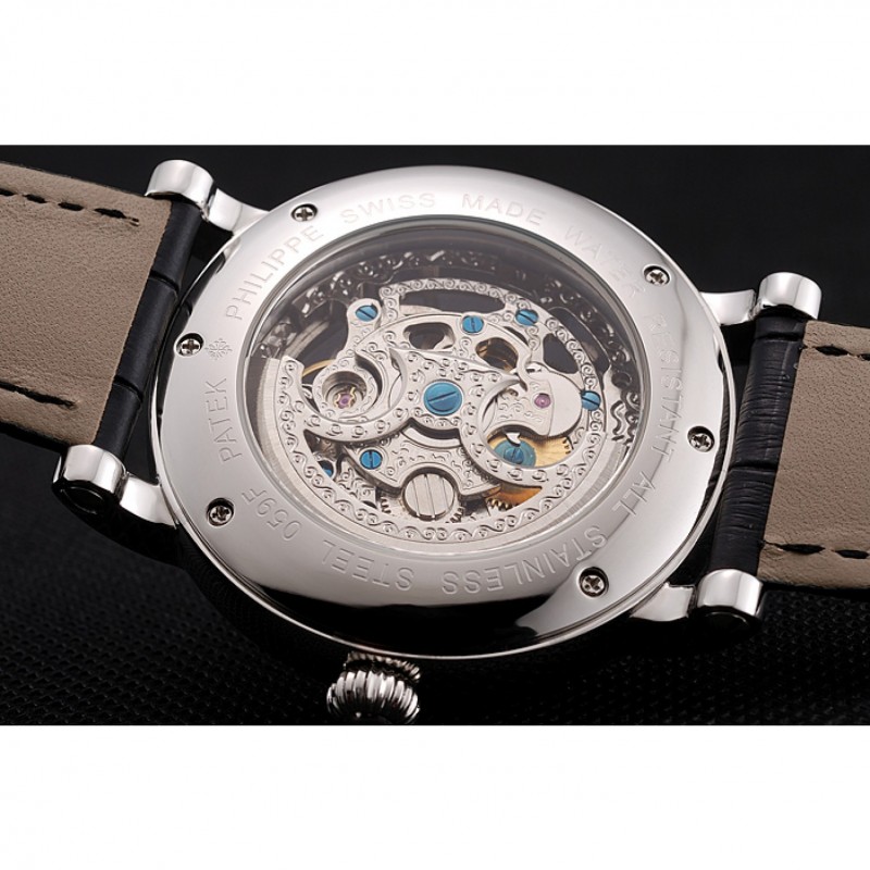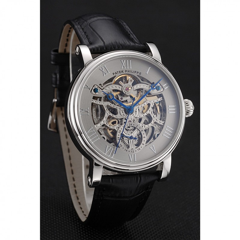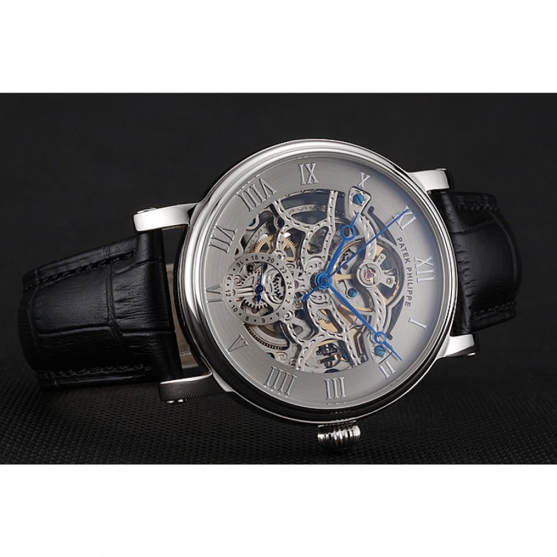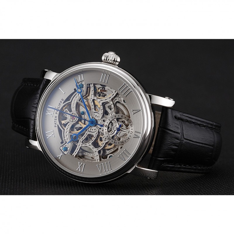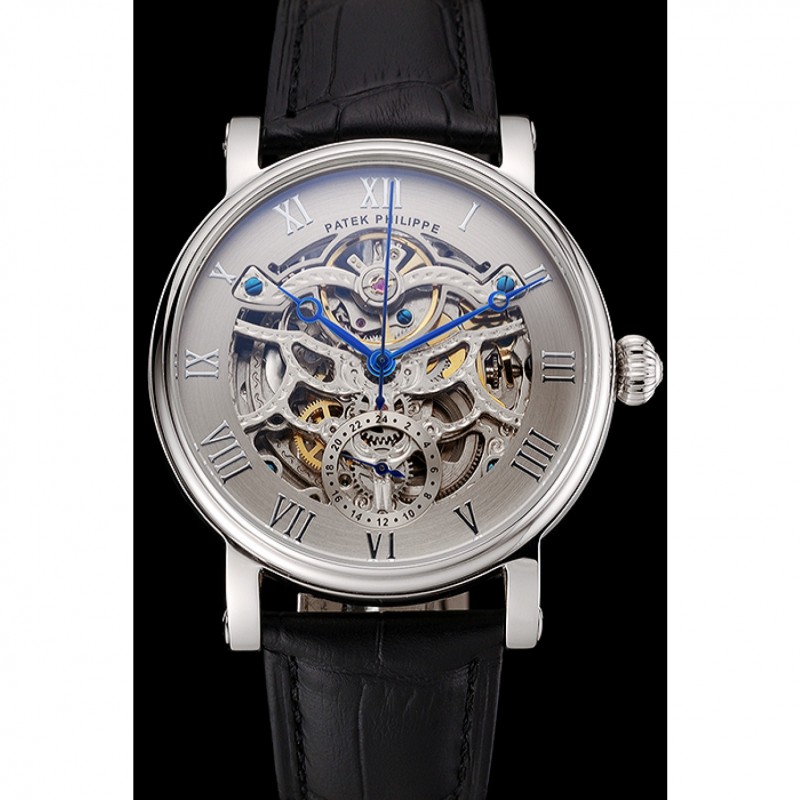 Patek Philippe Grand complicaciones gris Esqueleto Dial caja de acero inoxidable Negro correa de cuero 1453811