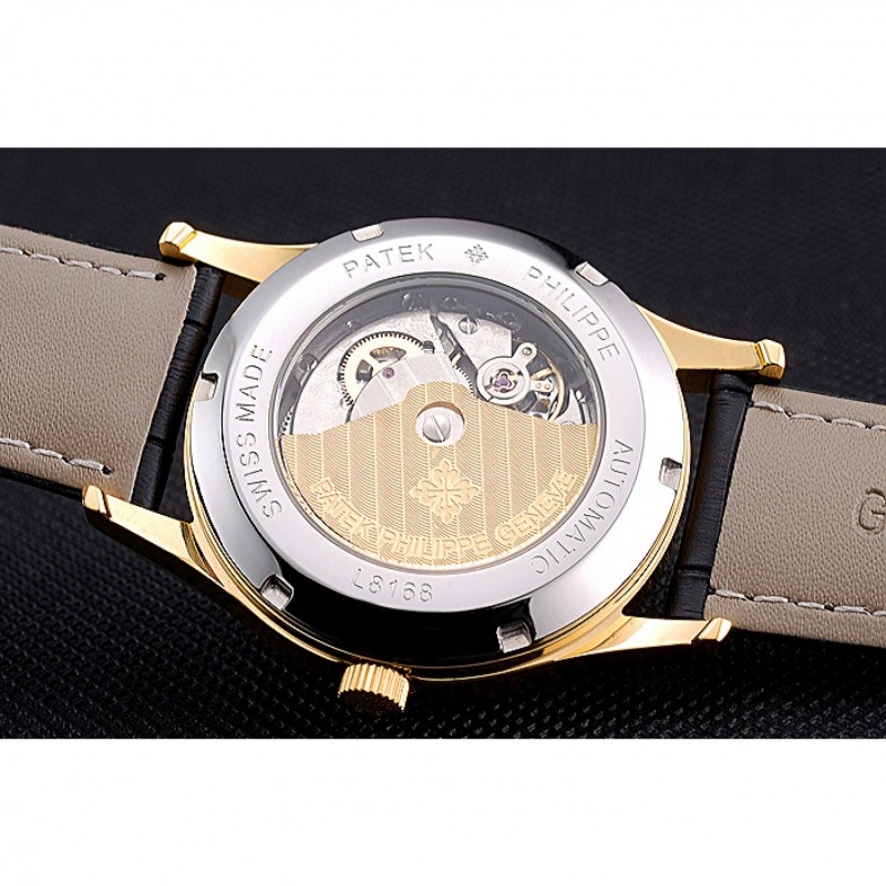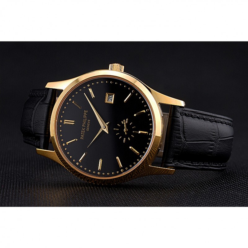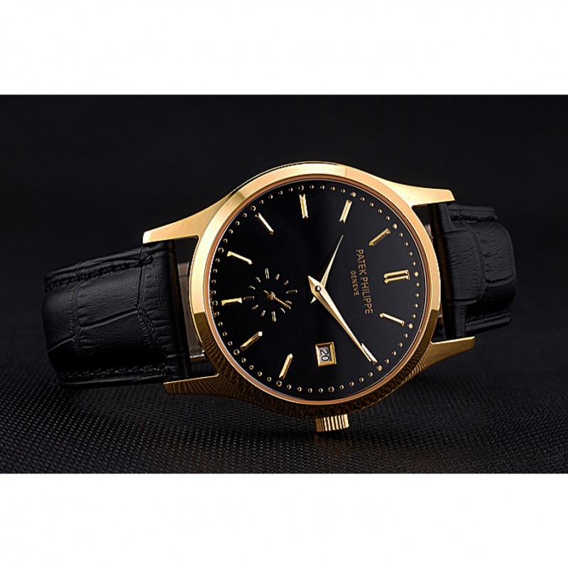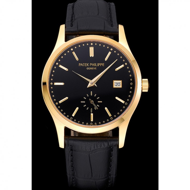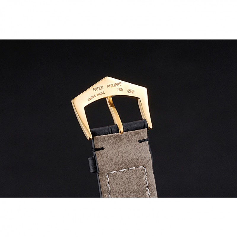 Patek Philippe Negro Dial Caso Negro Oro correa de cuero 622845