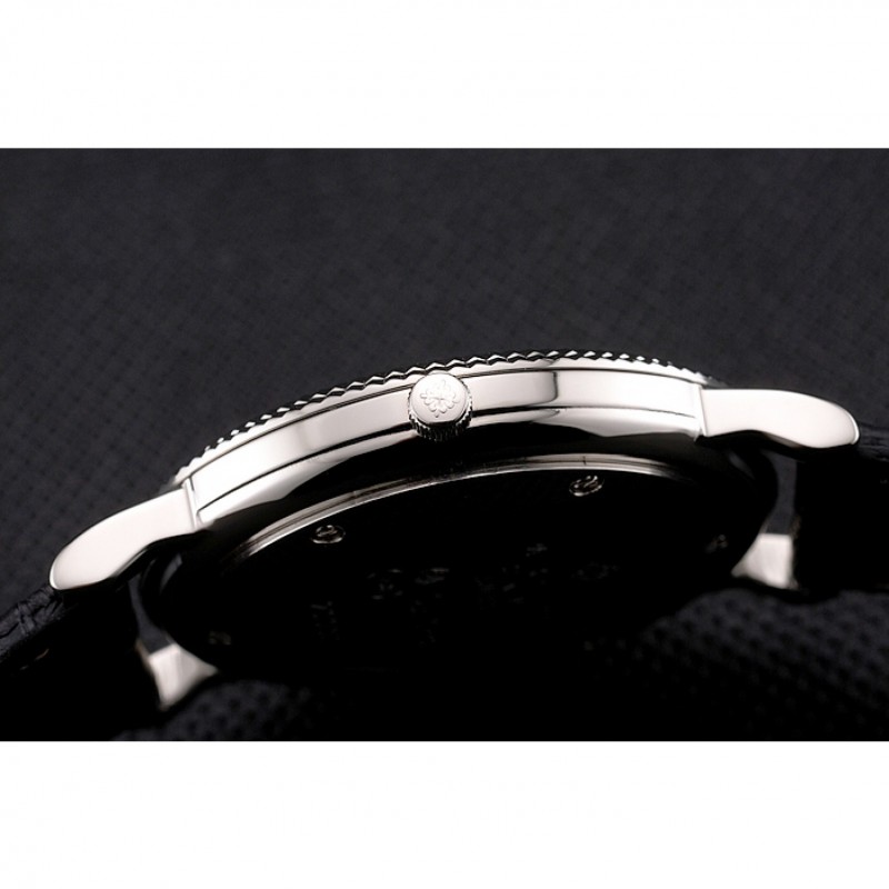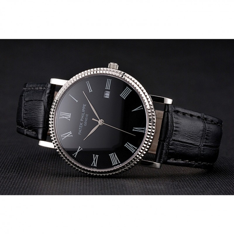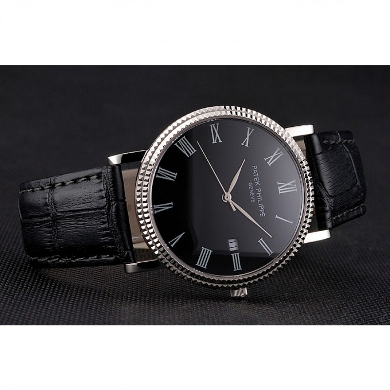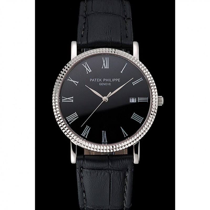 Patek Philippe Negro Dial correa de cuero de los números romanos Bisel acanalado caja de acero inoxidable Negro
