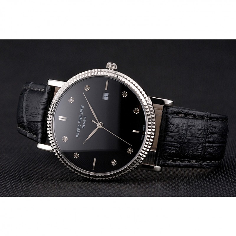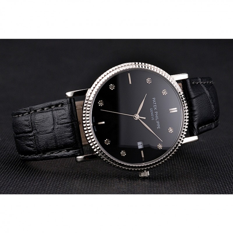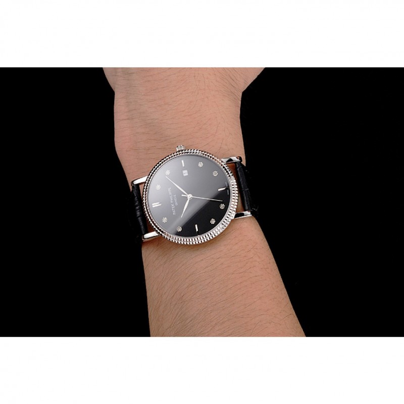 Patek Philippe Negro Dial correa de cuero del diamante marcas de la hora acanalado Bisel caja de acero inoxidable Negro