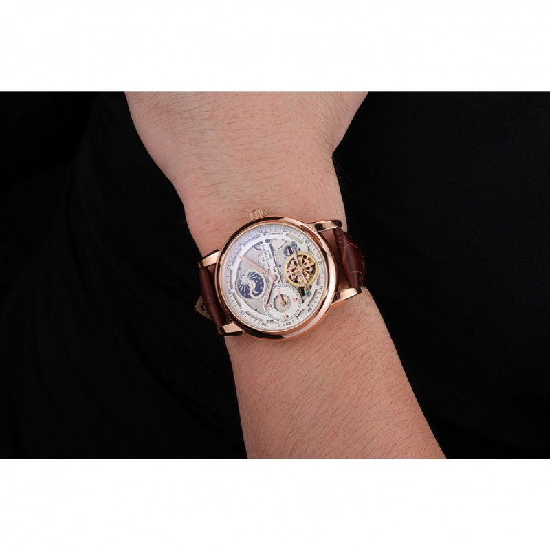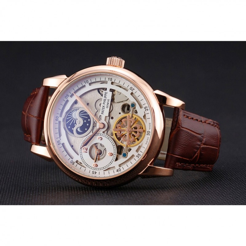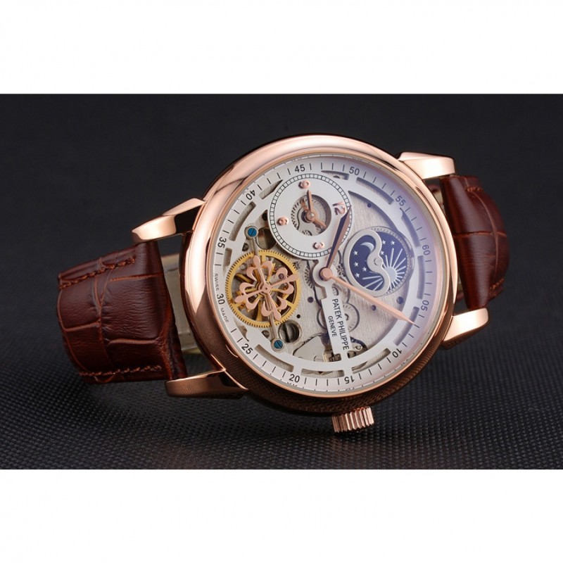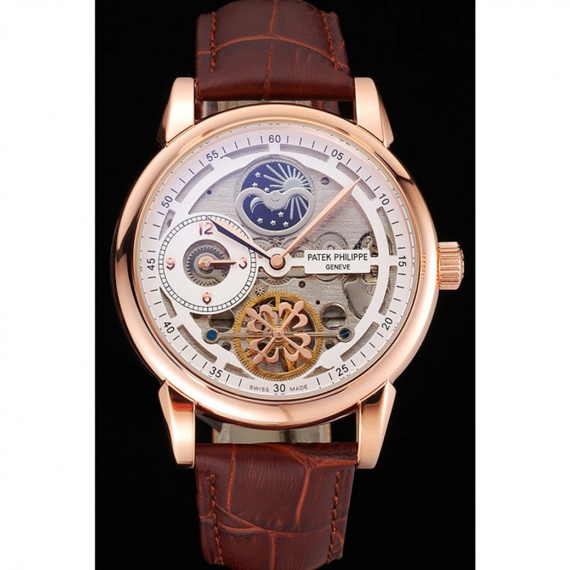 Patek Philippe Tourbillon Tiempo doble Fase lunar negro en esqueleto Dial correa de cuero de la caja de oro rosa Brown