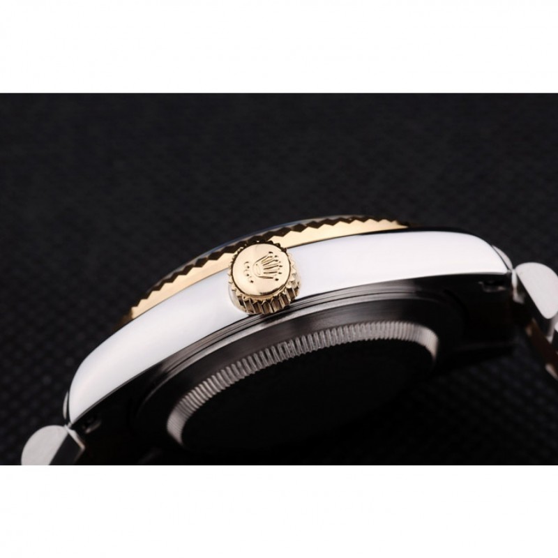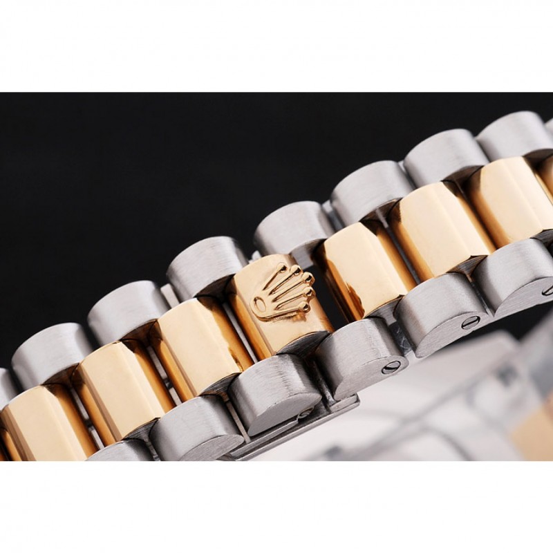 pulsera: cepillado de acero inoxidable y amarillo cadena de eslabones de oro con el doblez sobre el corchete y Rolex corona grabado