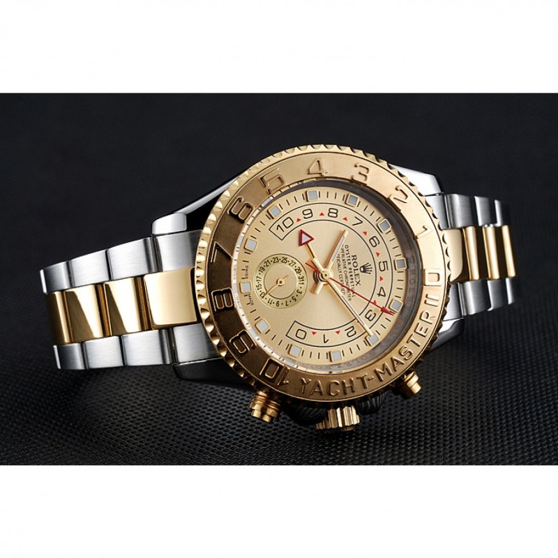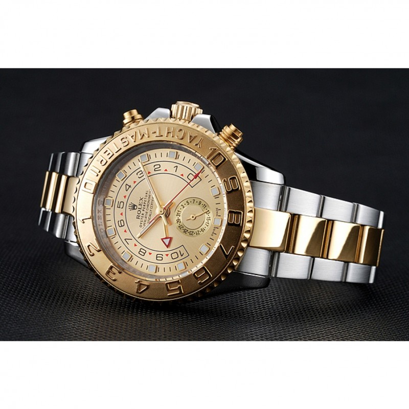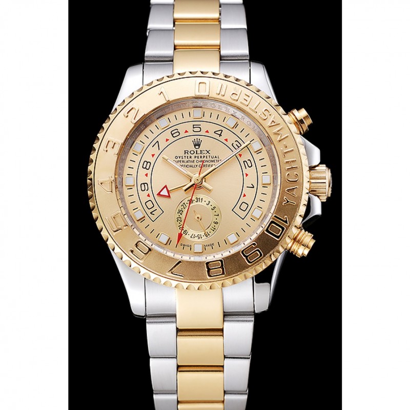Bisel: Chapado en oro bisel unidireccional calado con 1 a 10 marcas y Yacht Master grabado sobre un fondo azul esmaltado