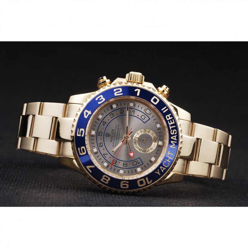 El Rolex Yacht-Master II es un reloj de lujo perfecto para los amantes del mar. Cuenta con un movimiento cinético automático, una caja chapada en oro amarillo y un bisel unidireccional de oro amarillo chapado con marcas de 1 a 10 y grabado Yacht-Master sobre un fondo esmaltado azul. Su pulsera es un brazalete de eslabones de oro amarillo con grabado Rolex en el interior del cierre desplegable y un logotipo Rolex en la parte superior. El reloj es resistente al agua pero no impermeable.