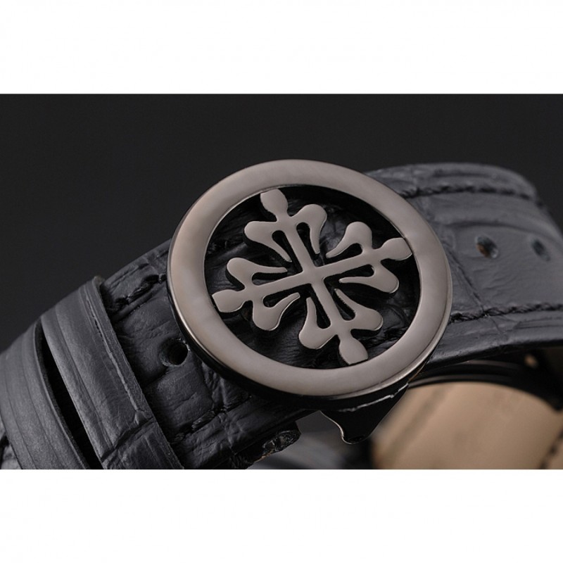 pulsera: logotipo y correa de cuero Patek Philippe de calor en relieve de cocodrilo negro con el logotipo de Patek Philippe tallada broche de gancho hebilla de iones de chapado