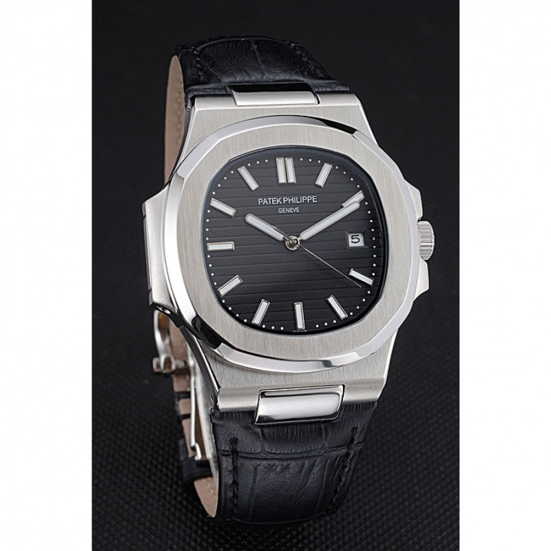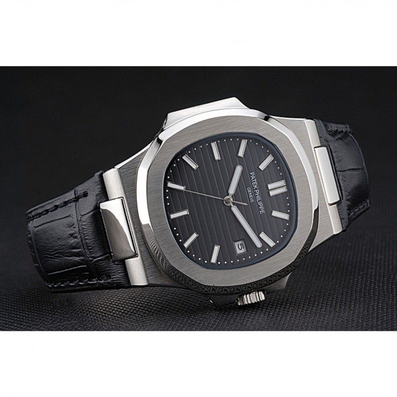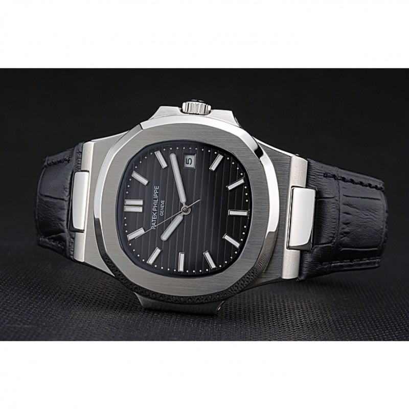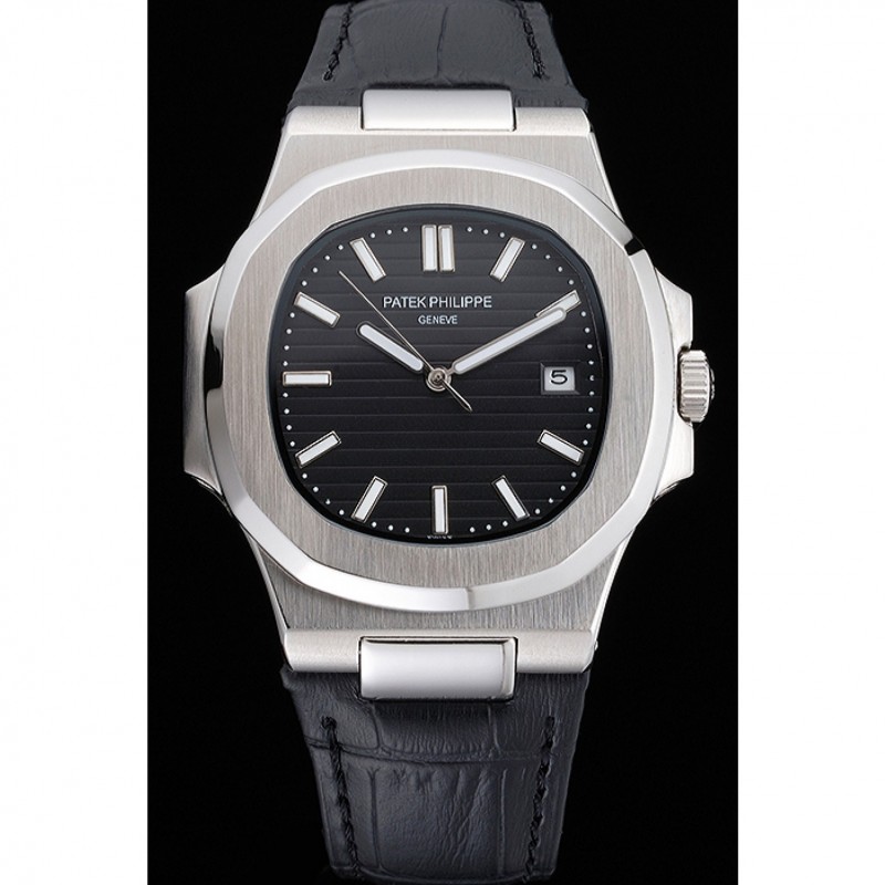 SS Patek Philippe Nautilus Negro Dial correa de cuero de la caja de acero inoxidable cepillado Negro