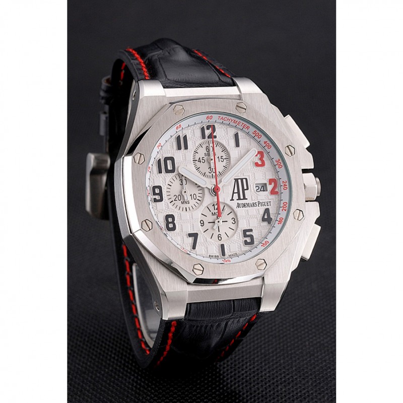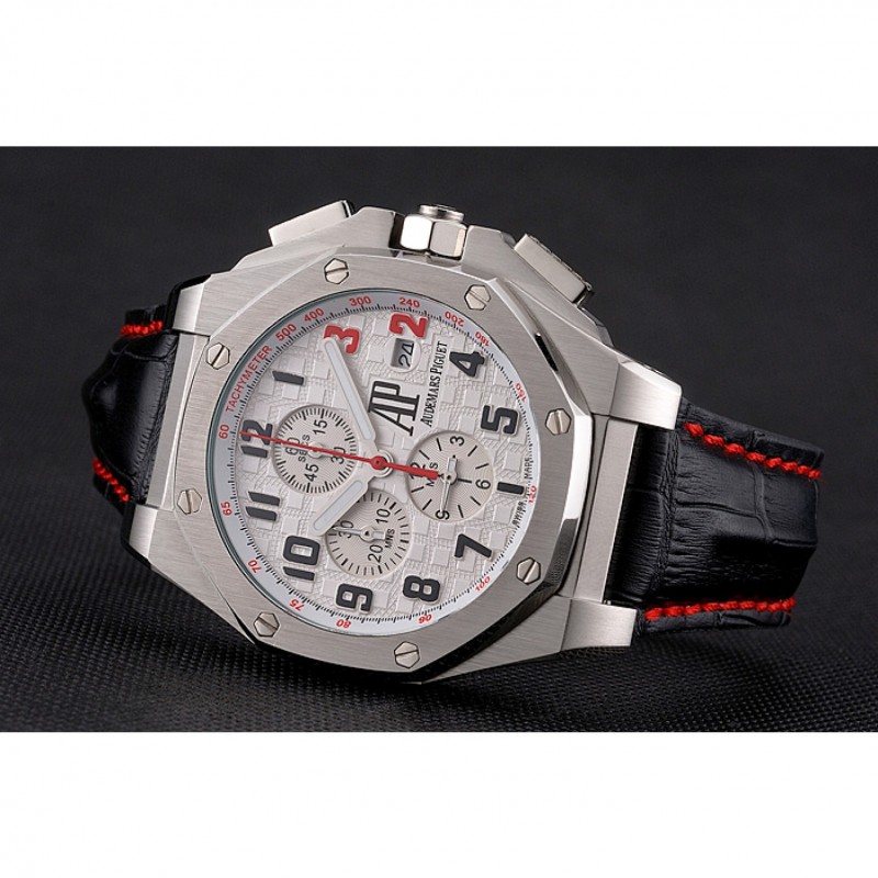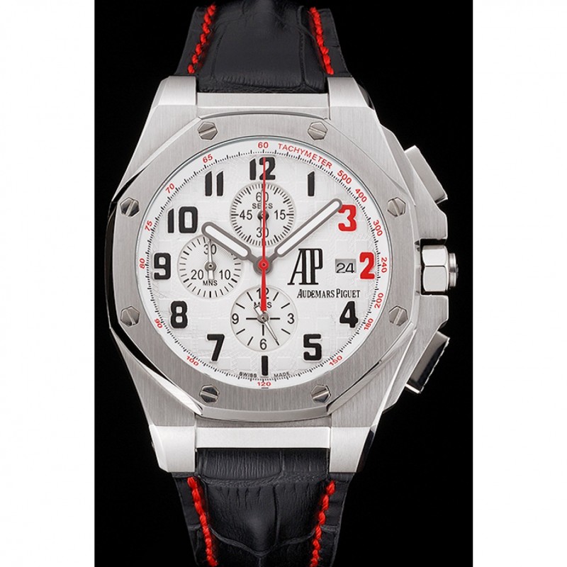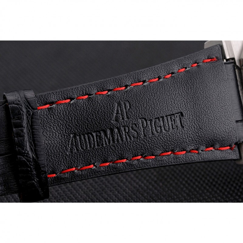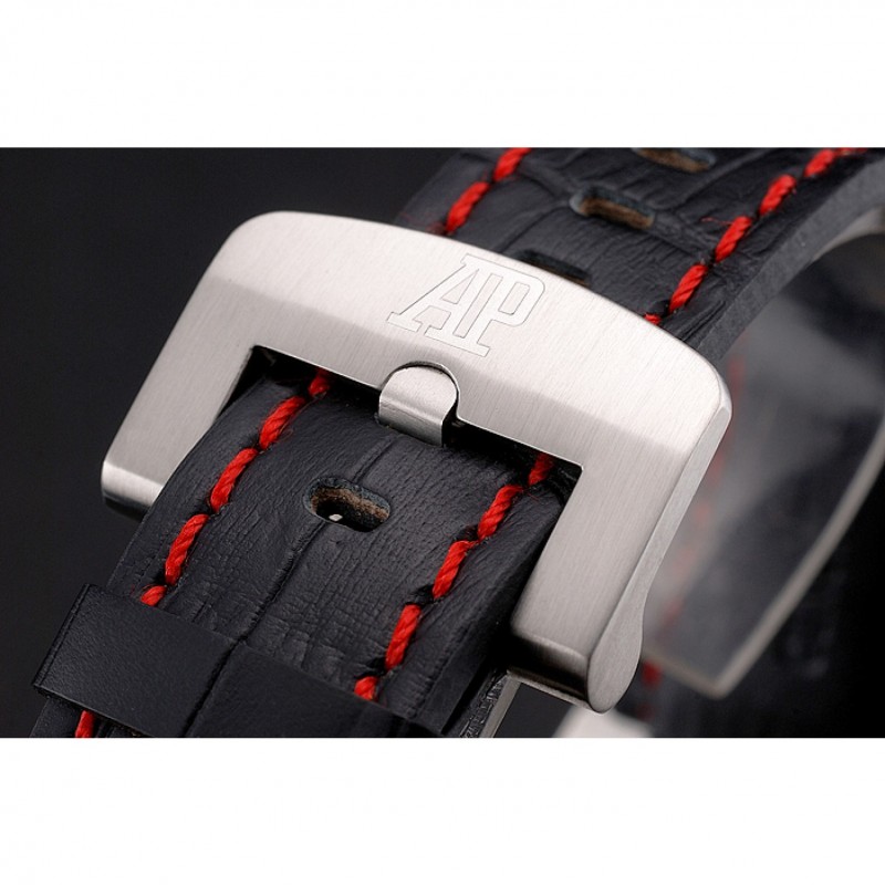 pulsera: Audemars Piguet y correa de cuero de calor logotipo en relieve de cocodrilo negro con costuras de hilo rojo y logo Audemars Piguet grabado acero inoxidable cepillado de gancho hebilla de cierre