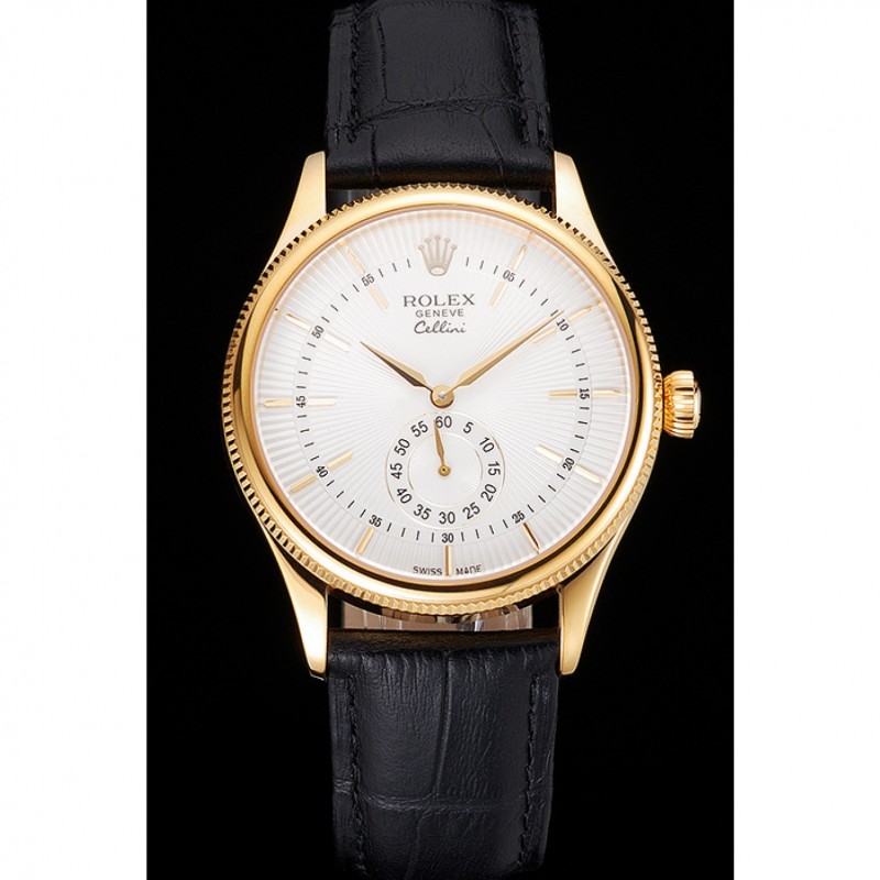 Suiza Rolex Cellini Blanco Dial correa de cuero de la caja Negro Oro