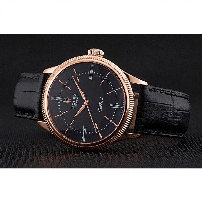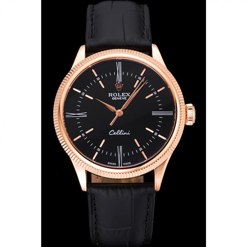 Suiza Rolex Cellini Caja Oro Rosa Tiempo Dial Negro Cuero Negro pulsera 622656