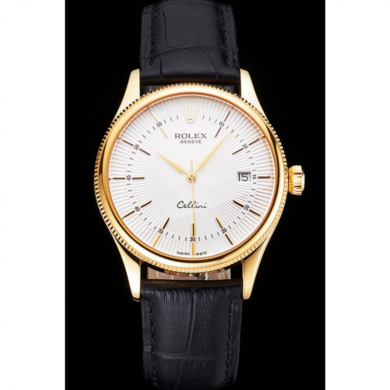 Suiza Rolex Cellini Fecha esfera blanca correa de cuero de la caja Negro Oro