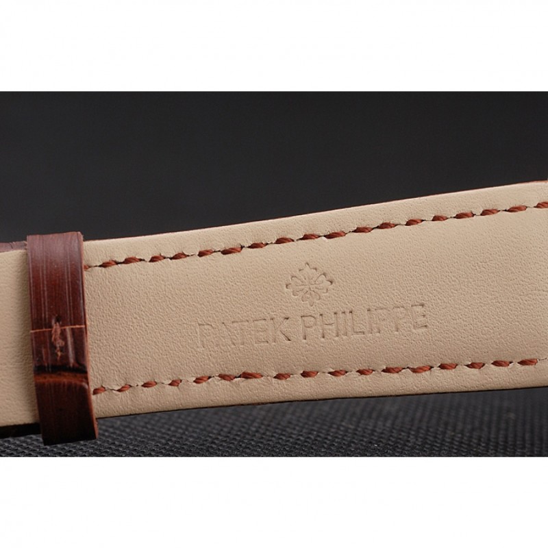 pulsera: logotipo y correa de piel de cocodrilo marrón en relieve de calor Patek Philippe con el logotipo de Patek Philippe 18k tallado de oro rosa plateado gancho hebilla de cierre