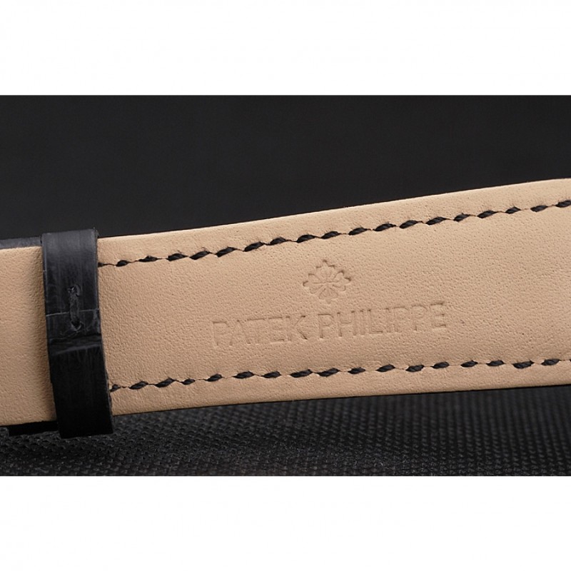 pulsera: logotipo y correa de cuero Patek Philippe de calor en relieve de cocodrilo negro con el logotipo de Patek Philippe tallada broche de gancho hebilla de iones de chapado