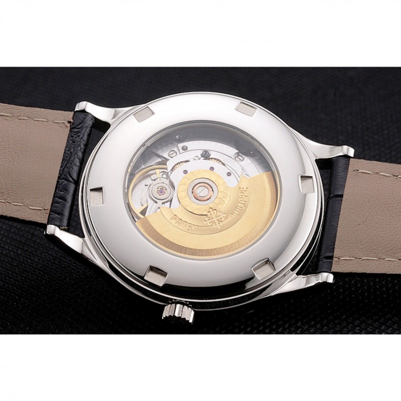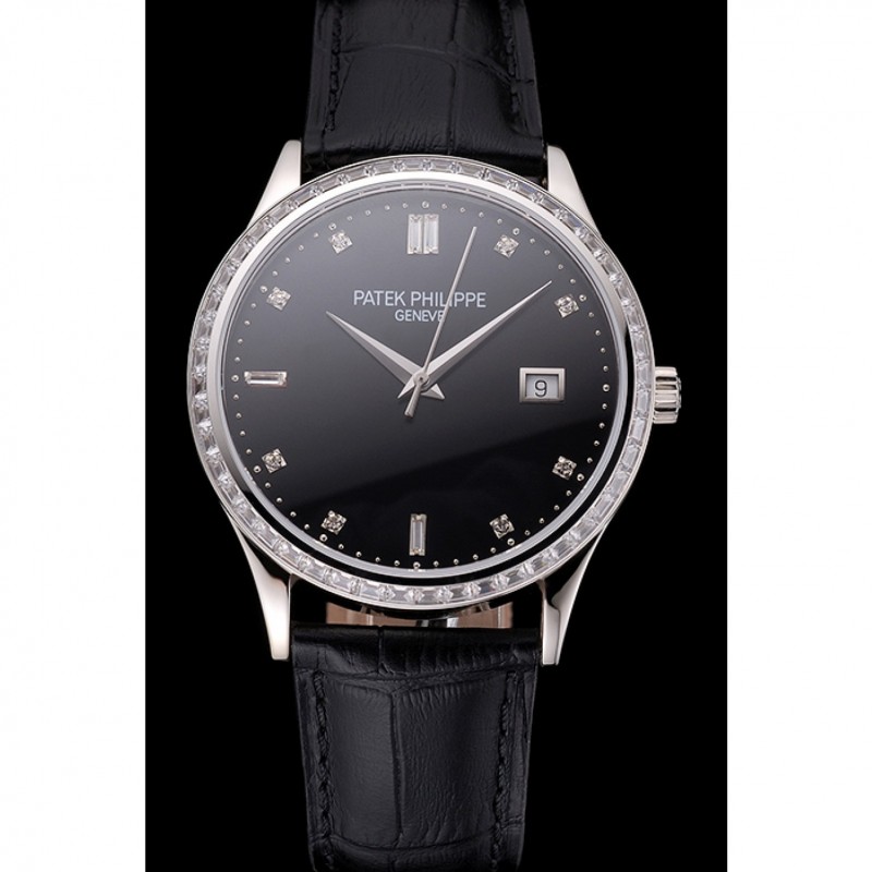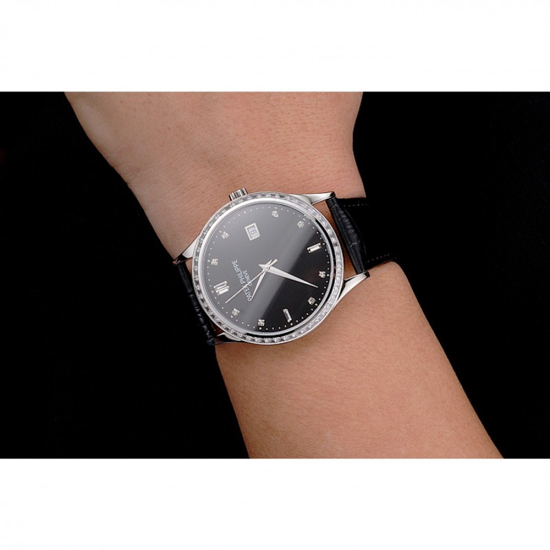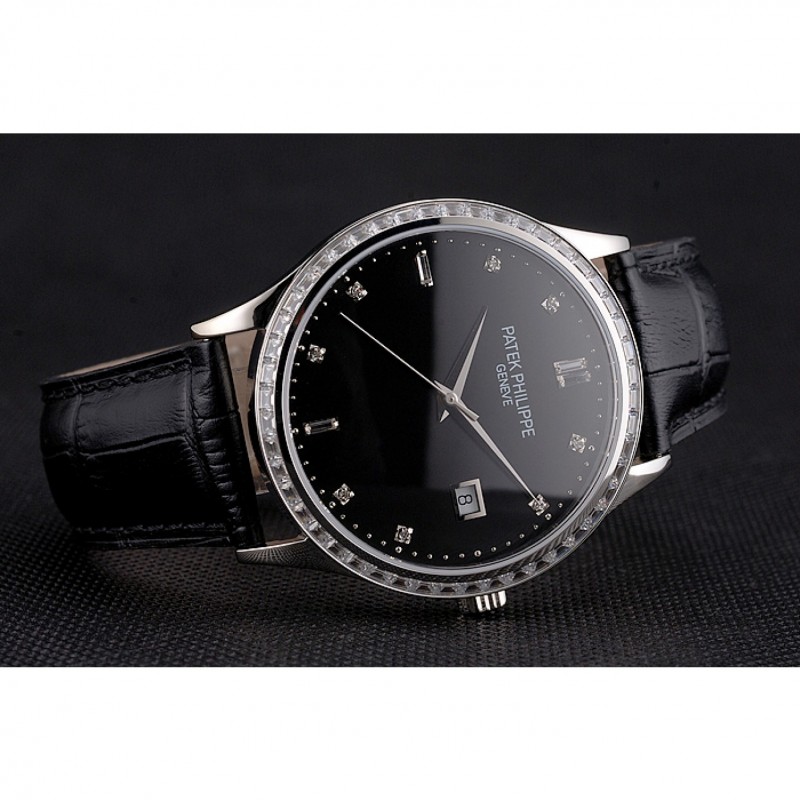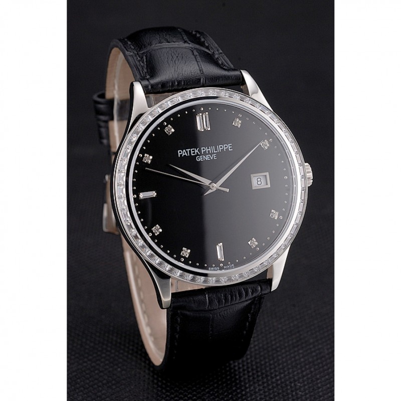 Suizo Patek Philippe Negro Dial correa de cuero del diamante del bisel caja de acero inoxidable Negro